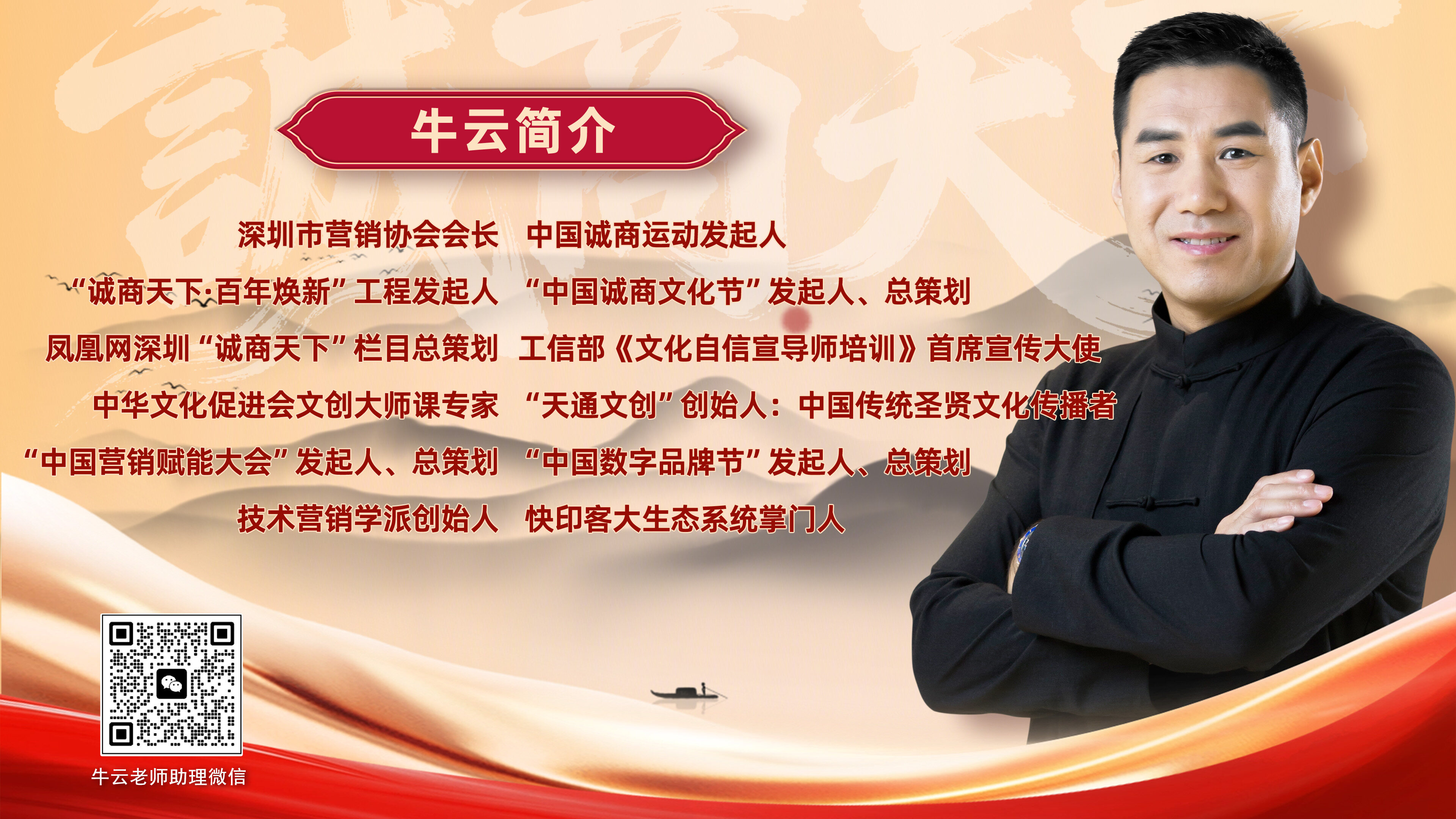 牛云:技术营销学派创始人、传统文化学者、凤凰网深圳诚商天下栏目总策划、中国诚商运动发起人、2025年发起“诚商天下百年焕新”工程,工信部“尚工”行动《文化自信宣导师培训》首席宣传大使。